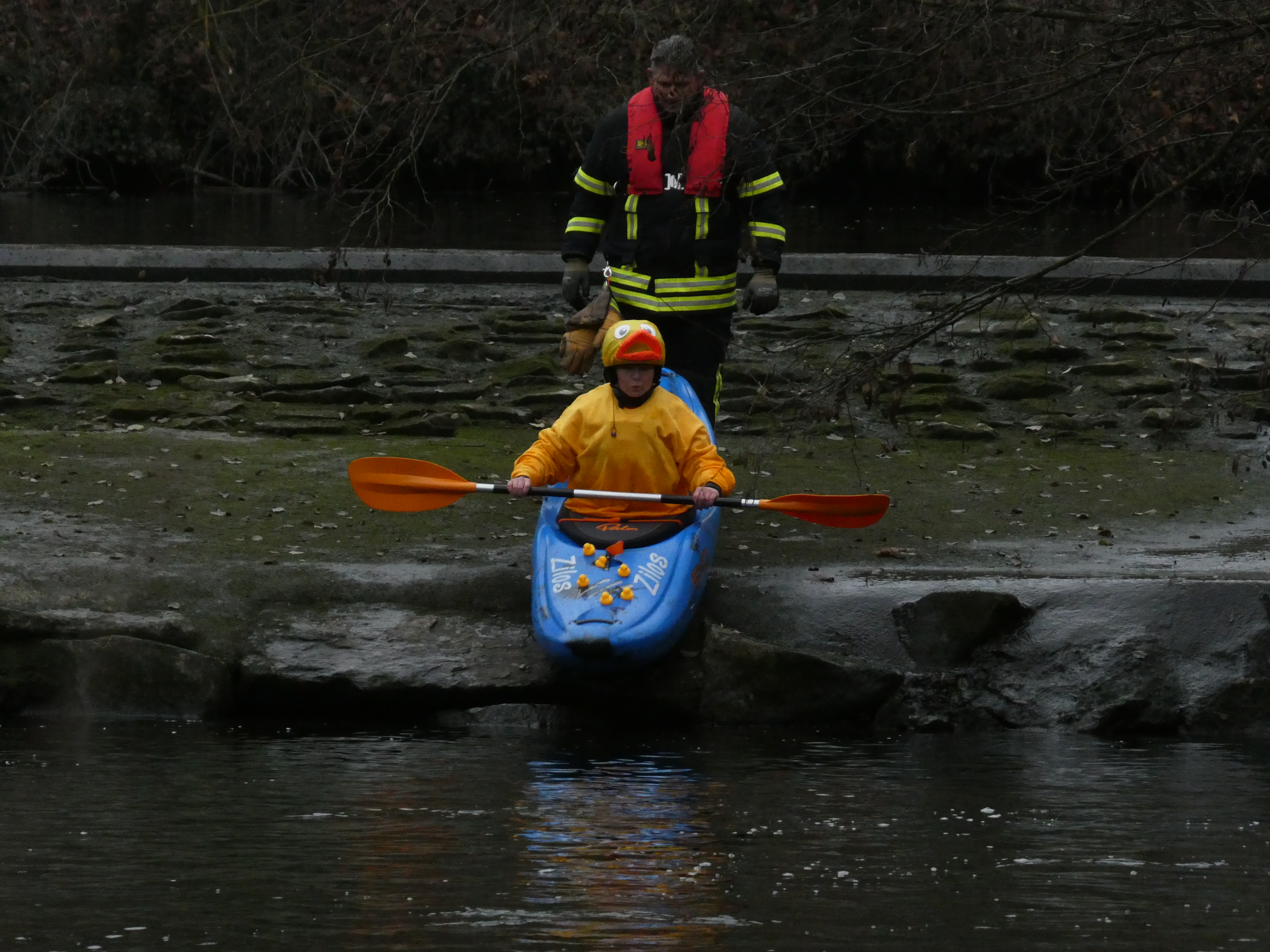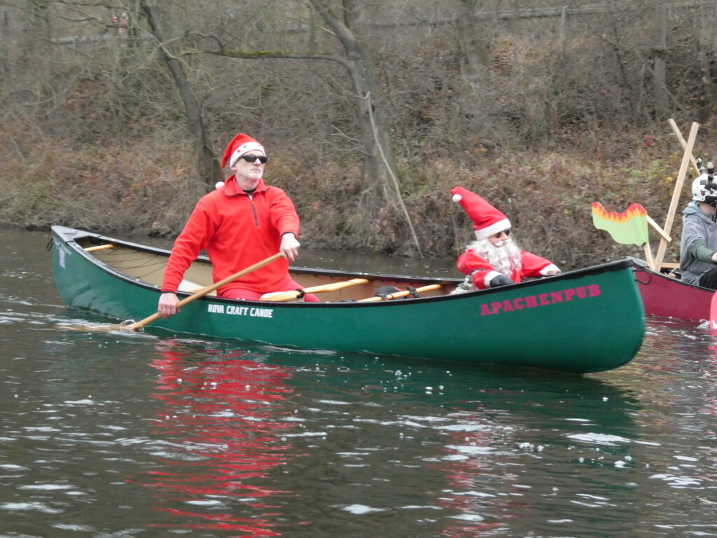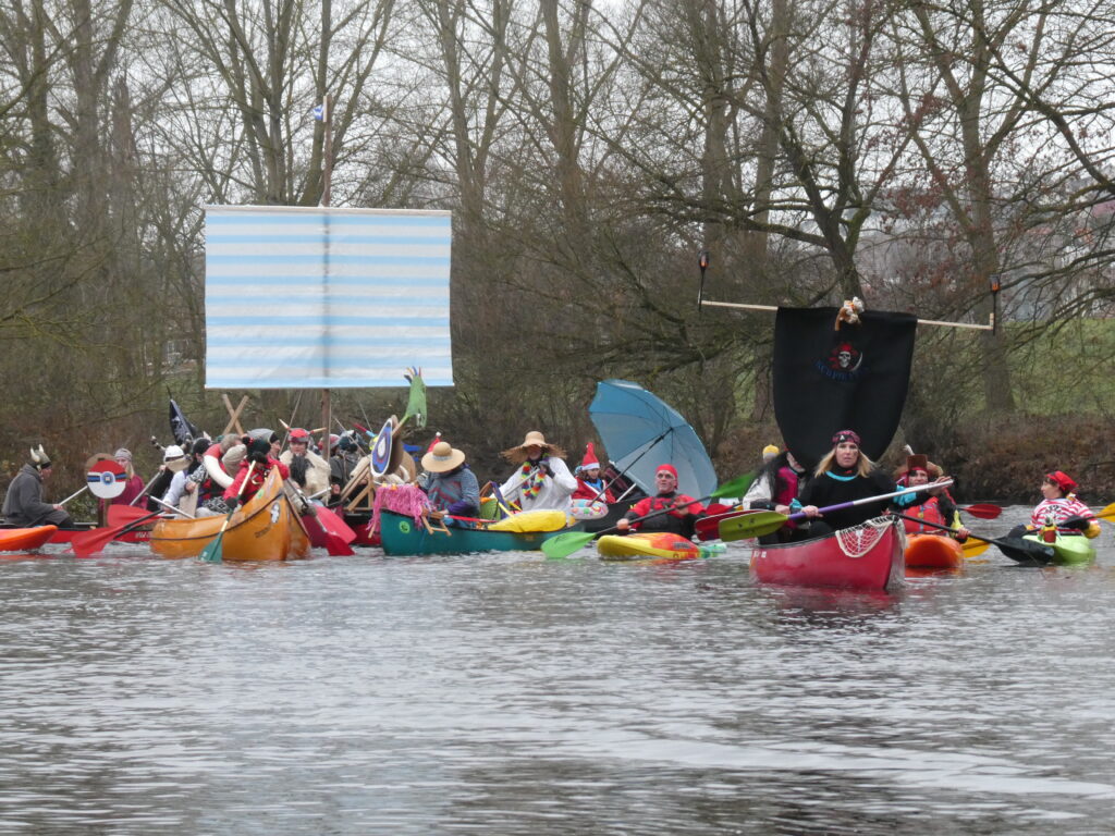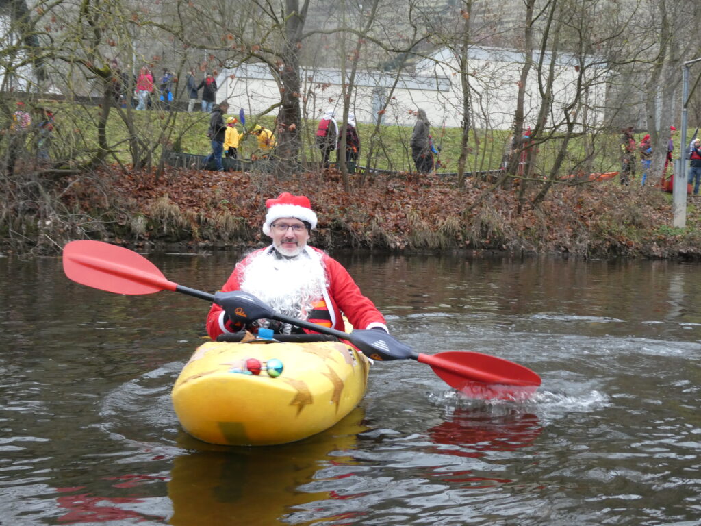 Eine liebgewonnene Tradition feierte ihr silbernes Jubiläum, unsere Heiße-Herzen-Fahrt. Obwohl sich der 13. Dezember von seiner nebligen Seite zeigte, trafen sich ca. 55 Paddler und Kanumitglieder aus Vaihingen, Bietigheim und Esslingen um für den guten Zweck zu paddeln. Eine wackere fünfköpfige Gruppe fand die Strecke von Roßwag nach Vaihingen zu kurz und so startete diese vom Mühlacker Festplatz. Die anderen nutzten die Zeit in Roßwag, sich entsprechend in Schale zu werfen und ihre Boote zu dekorieren.