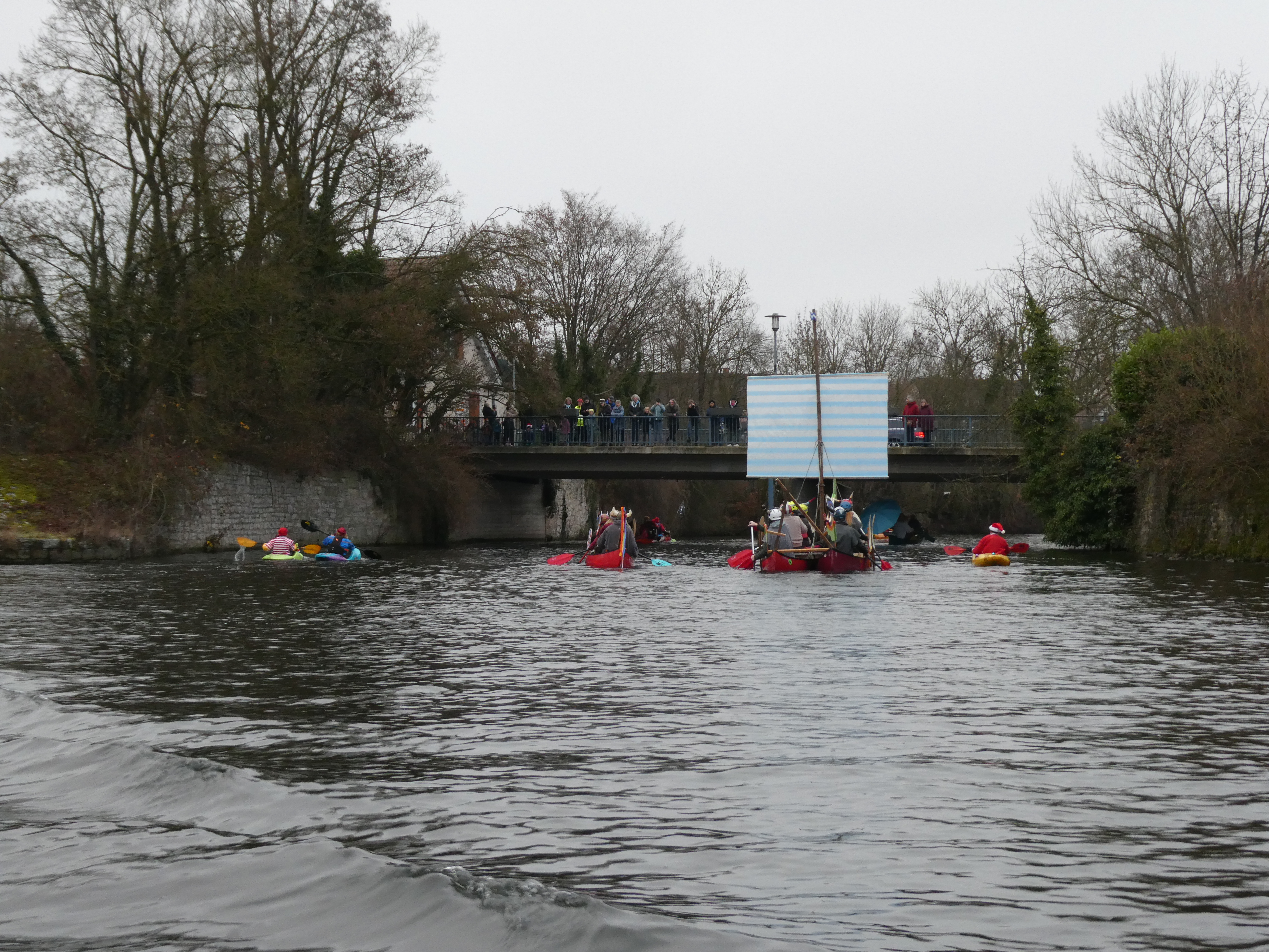 Begleitet von einem Ärzte-Krankenboot, mehreren geschmückten Tannenbäumen und Weihnachtsmännern, zwei Enten und einem Strandurlauberpaar, das den Dezember kurzerhand zum Sommer erklärte, den Heiligen Drei Königen, minus dem dritten, der sich auf dem Weg nach Vaihingen verirrt hat, und passend zum 13. Dezember eine Lucia.